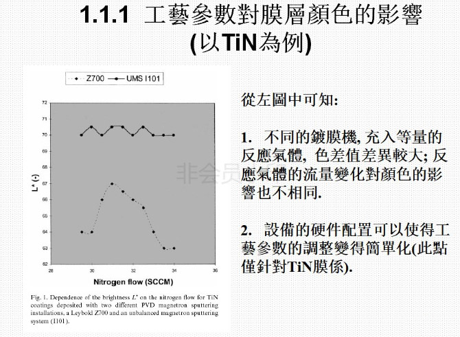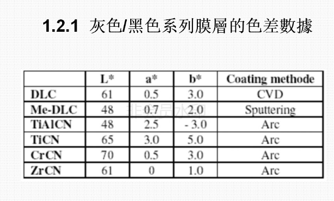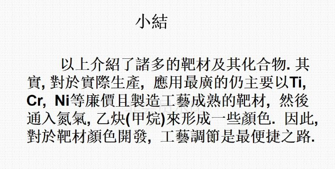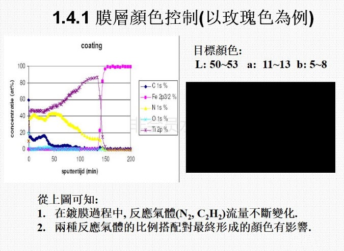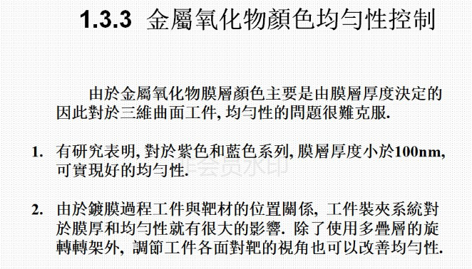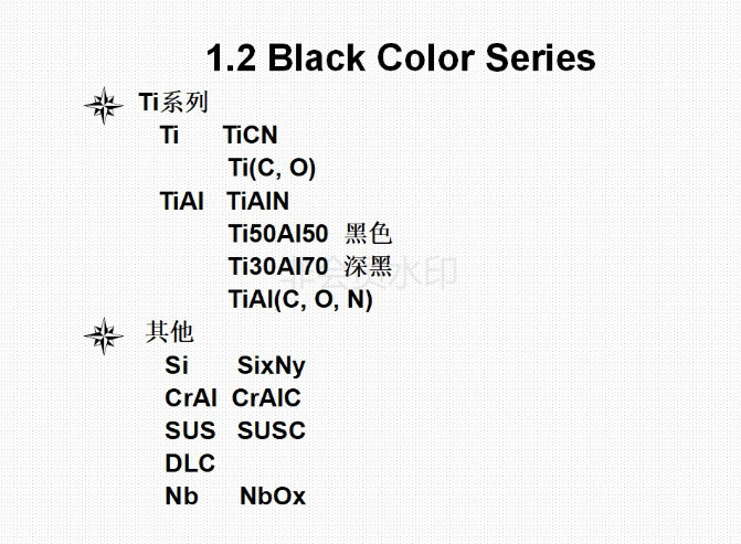6)、目前能夠做出的膜層的顏色有深金黃色,淺金黃色,咖啡色、古銅色、灰色、黑色、灰黑色,七彩色等。通過控制鍍膜過程中的相關(guān)參數(shù),可以控制鍍出的顏色;鍍膜結(jié)束后可以用相關(guān)的儀器對顏色值進(jìn)行測量,使顏色得以量化,以確定所鍍出的顏色是否滿足要求。