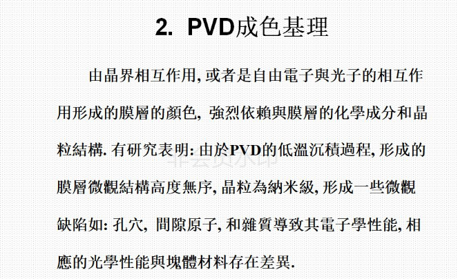 5)、PVD技術(shù)不僅提高了 鍍膜與基體材料的結(jié)合強(qiáng)度,涂層耗材種類繁多,還有多元復(fù)合涂層,形成不同的顏色的表面效果。